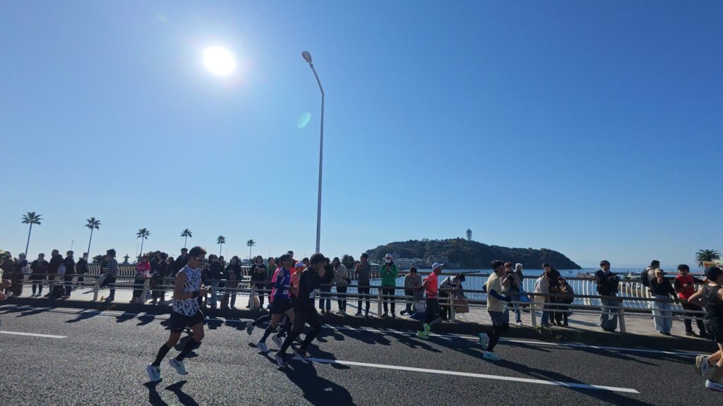 - スタート〜前半:大磯〜江の島方面へ向かう海沿いルート:序盤は太平洋を左手に見ながら進む爽快なストレート区間。江の島付近の応援が非常に多く、自然とペースが上がりやすいポイントです。