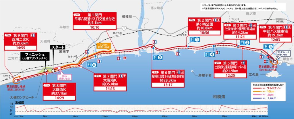 湘南国際マラソンのコースは、国道134号線を中心に往復するシンプルなレイアウト
